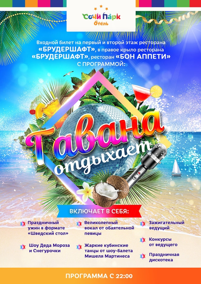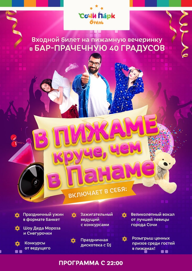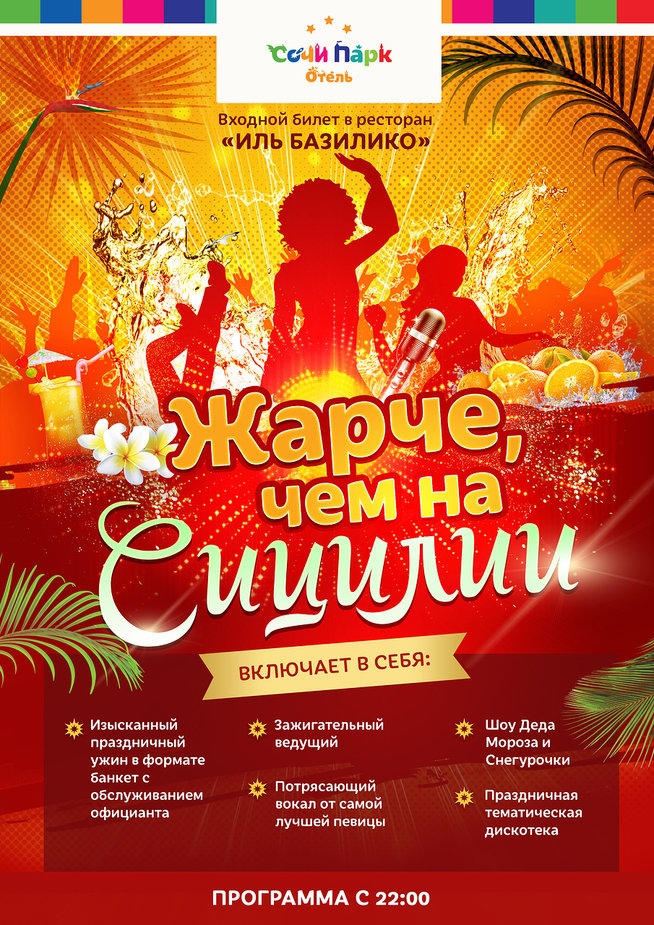 «Сальса в Сочи», «Жарче, чем на Сицилии», «В пижаме круче, чем в Панаме» и «Жаркий новый год в парилке» - лишь часть запланированных праздничных программ в ОК Сочи Парк Отель. Гостям, предпочитающим банкетное обслуживание, подойдут для проведения новогоднего праздника рестораны «Иль Базилико», «Граф Орлов» и бар «Трое в лодке». А кто желает провести Новый год максимально жарко - могут арендовать баню, спа-комплекс, кафе «Малина» или «Бар 17», где состоится зажигательная программа — «Жаркий Новый год - все свои».